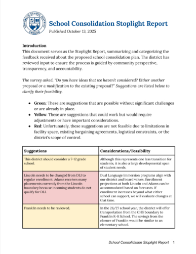 We have had this feedback reviewed by an Oregon State University researcher, who developed the CSD School Consolidation Community Engagement Report, highlighting common themes. Additionally, the district created a Stoplight Report to discuss the feasibility of suggested proposals.