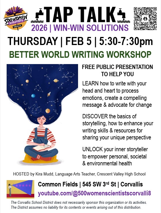 With guided instruction from Kira Mudd (Language Arts Teacher at CV High School), discover the basics of storytelling, how to enhance your writing skills, & the joy of sharing your perspective in a supportive environment. Join in person or online at youtube.com/@500womenscientistscorvalli8/streams.