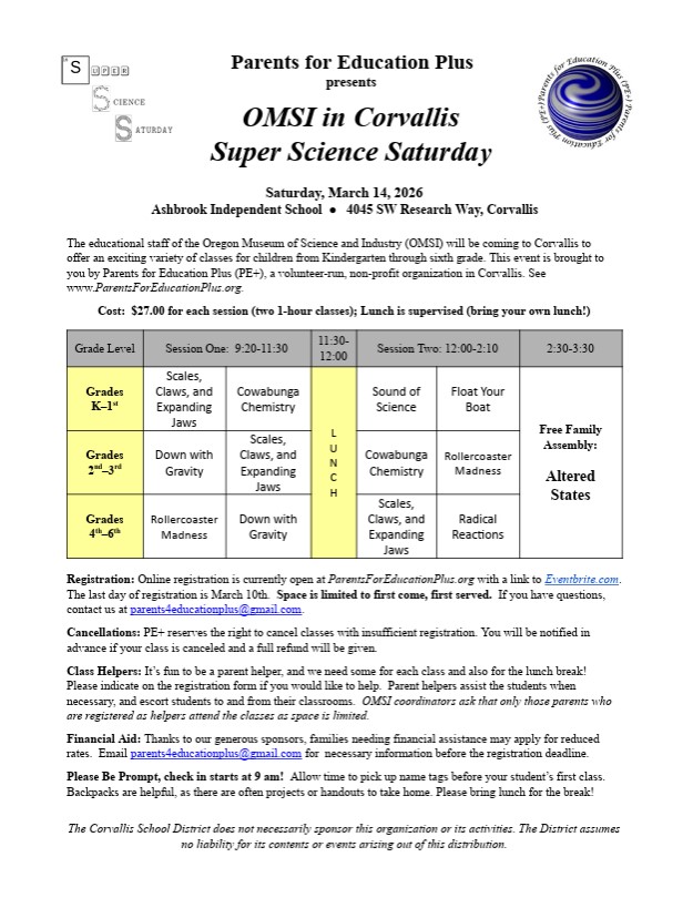 The educational staff of the Oregon Museum of Science and Industry (OMSI) will be coming to Corvallis to offer an exciting variety of classes for children from K-6. This event is brought to you by Parents for Education Plus (PE+), a volunteer-run, non-profit organization in Corvallis.