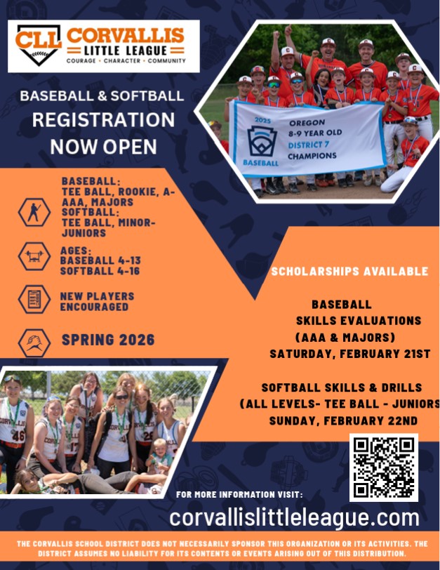 Registration is now open for Corvallis Little League Spring Baseball and Softball programs. Sign up today. Scholarships available.