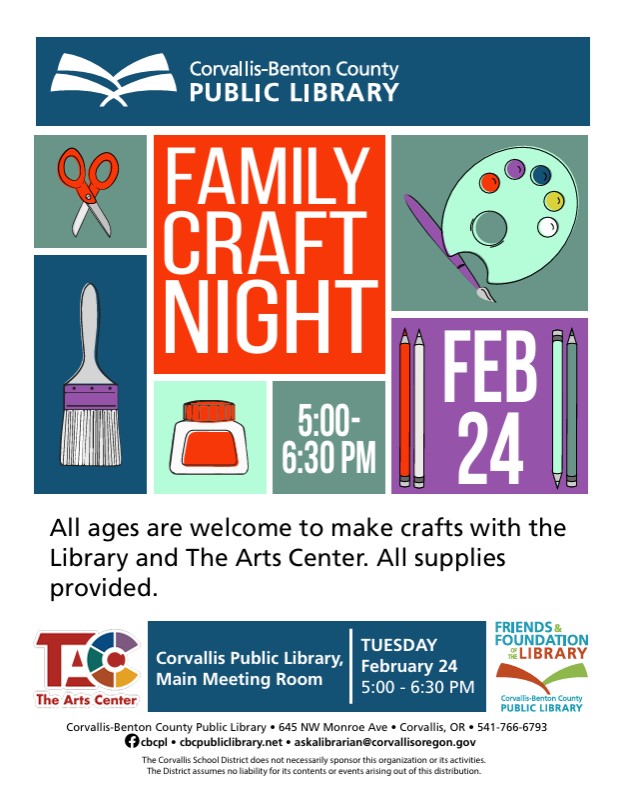 All ages are welcome to make crafts with the Library and The Arts Center. All supplies provided.