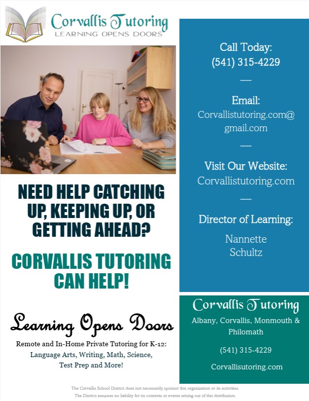 Corvallis Tutoring offers one to one and small group private in home tutoring in most subject areas and levels for all ages with local subject matter experts. Subject areas include but not limited to: language arts, math, science, computer science/IT and several foreign languages including Spanish.