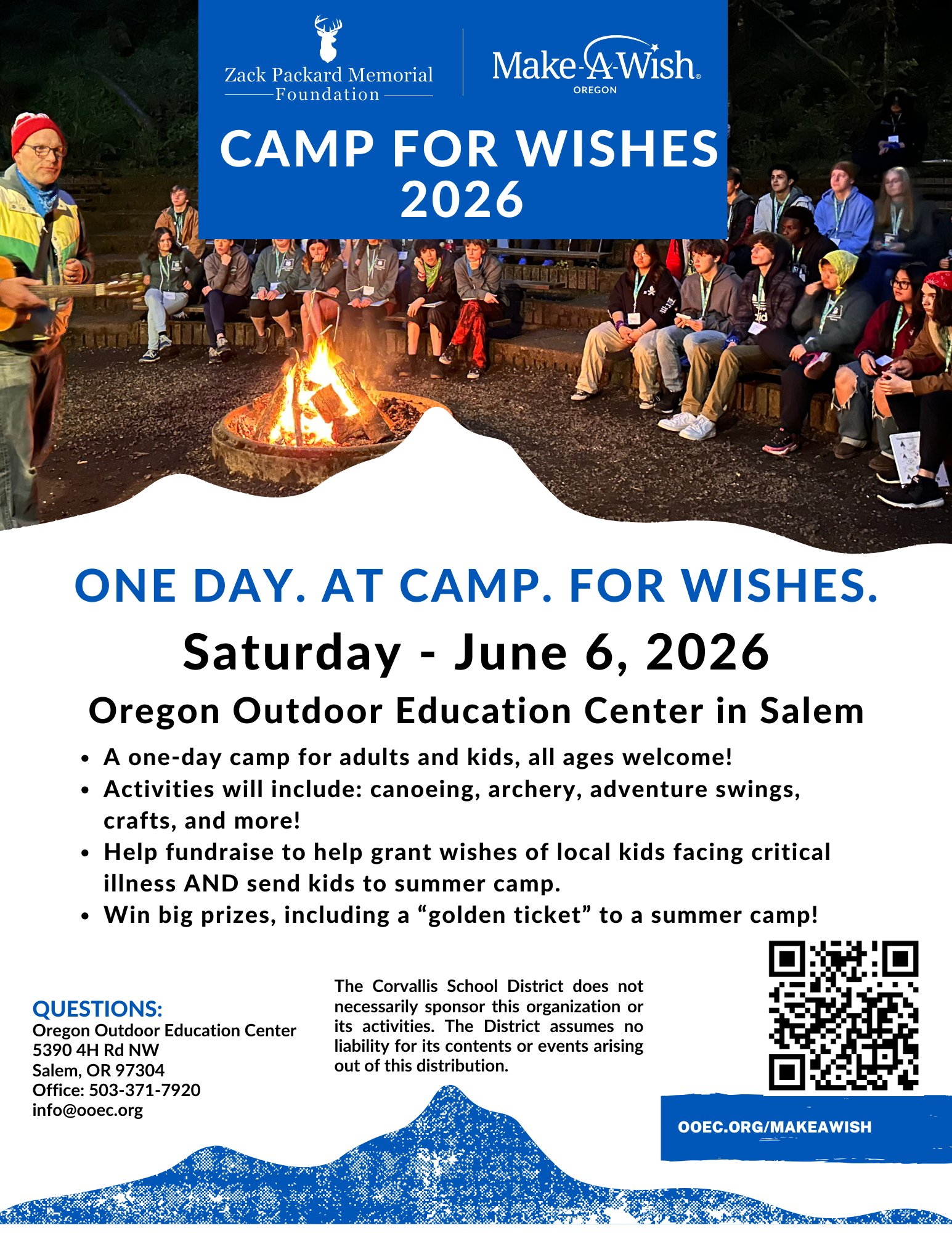 ONE DAY. AT CAMP. FOR WISHES. Camp For Wishes is a one-day summer camp for adults and kids at the Oregon Outdoor Education Center. Like any camp, it will include canoeing, archery, crafts, and other fun activities spent in the beautiful outdoors.