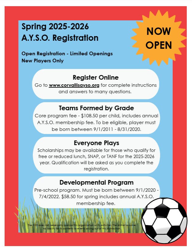 Registration is now open with limited openings for the spring 2026 season. Practices are held during the week and all games are played on Saturday at Adams Elementary fields. Anyone who played in the fall is automatically registered for the spring season.